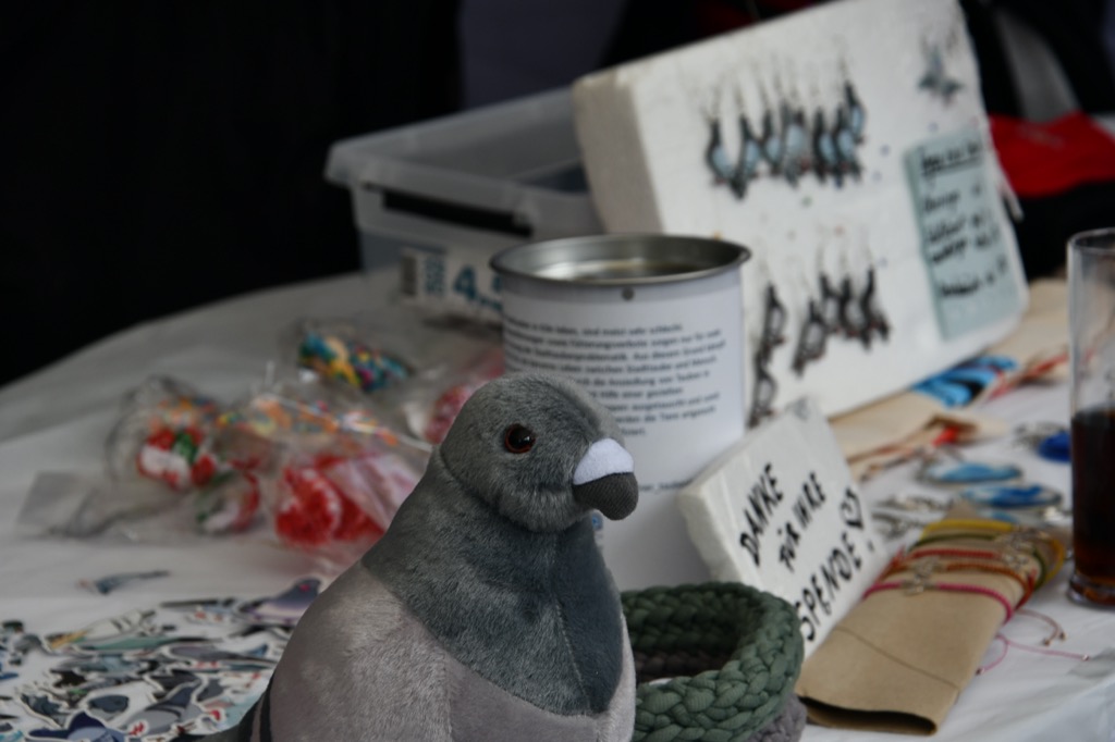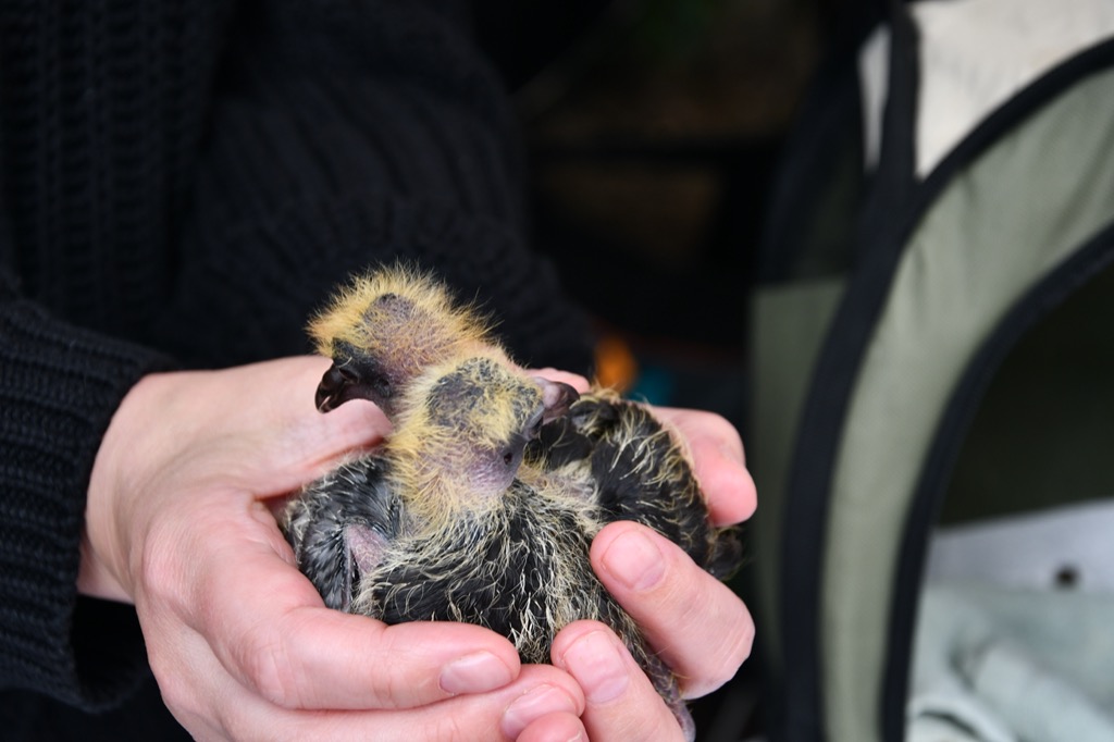 die Taubenhilfe samt zweier Küken, die kontinuierlich versorgt werden mussten. Die Taubenhilfe engagiert sich sich für verletzte und verwaiste Stadttauben.